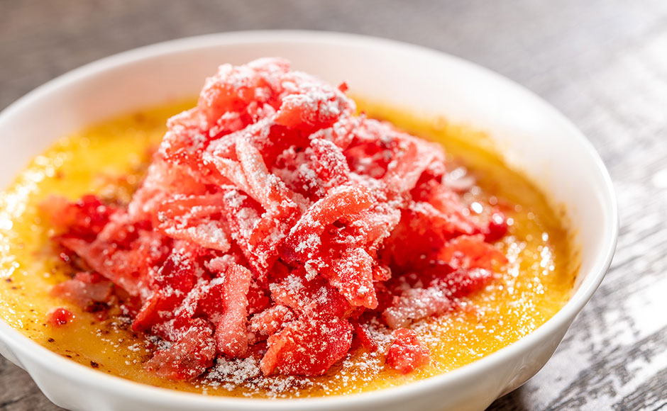 Smooth mascarpone crème brûlée topped with sweet and tangy strawberry confiture.