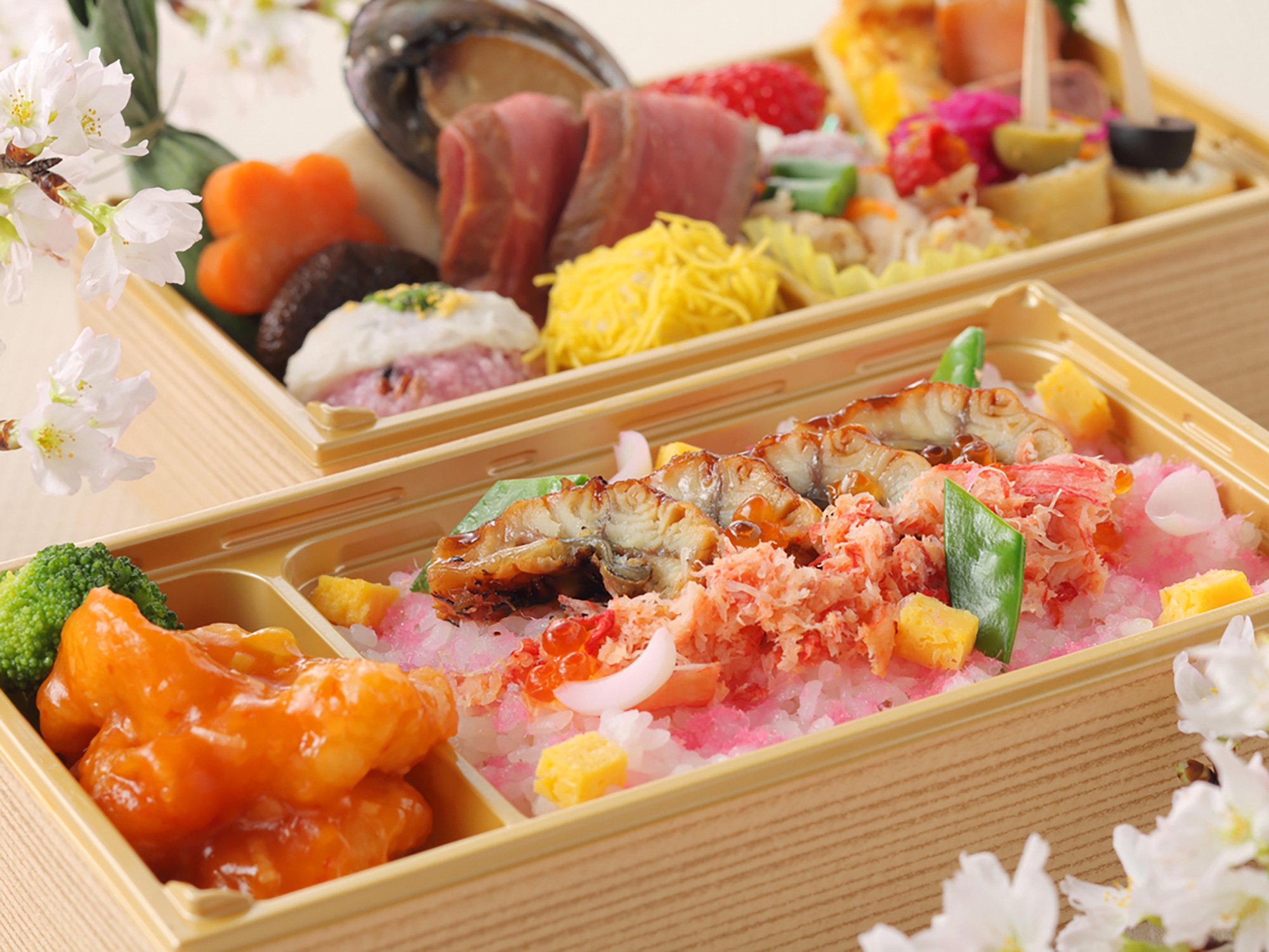 海老ピラフ / 蟹爪フライ / 海老フライ / 穴子道明寺 / 花人参 / 菜の花 / そら豆天 / さわら竜田揚げ / トマトチーズハンバーグ / 牛肉のステーキ / リコッタチーズとほうれん草のラビオリ / コーヒー煮豆 / ふきの煮物 / 紅茶鴨のスモーク / 厚焼き玉子 / 三色団子 / チーズとオリーブのピンチョス / ソフトサラミ