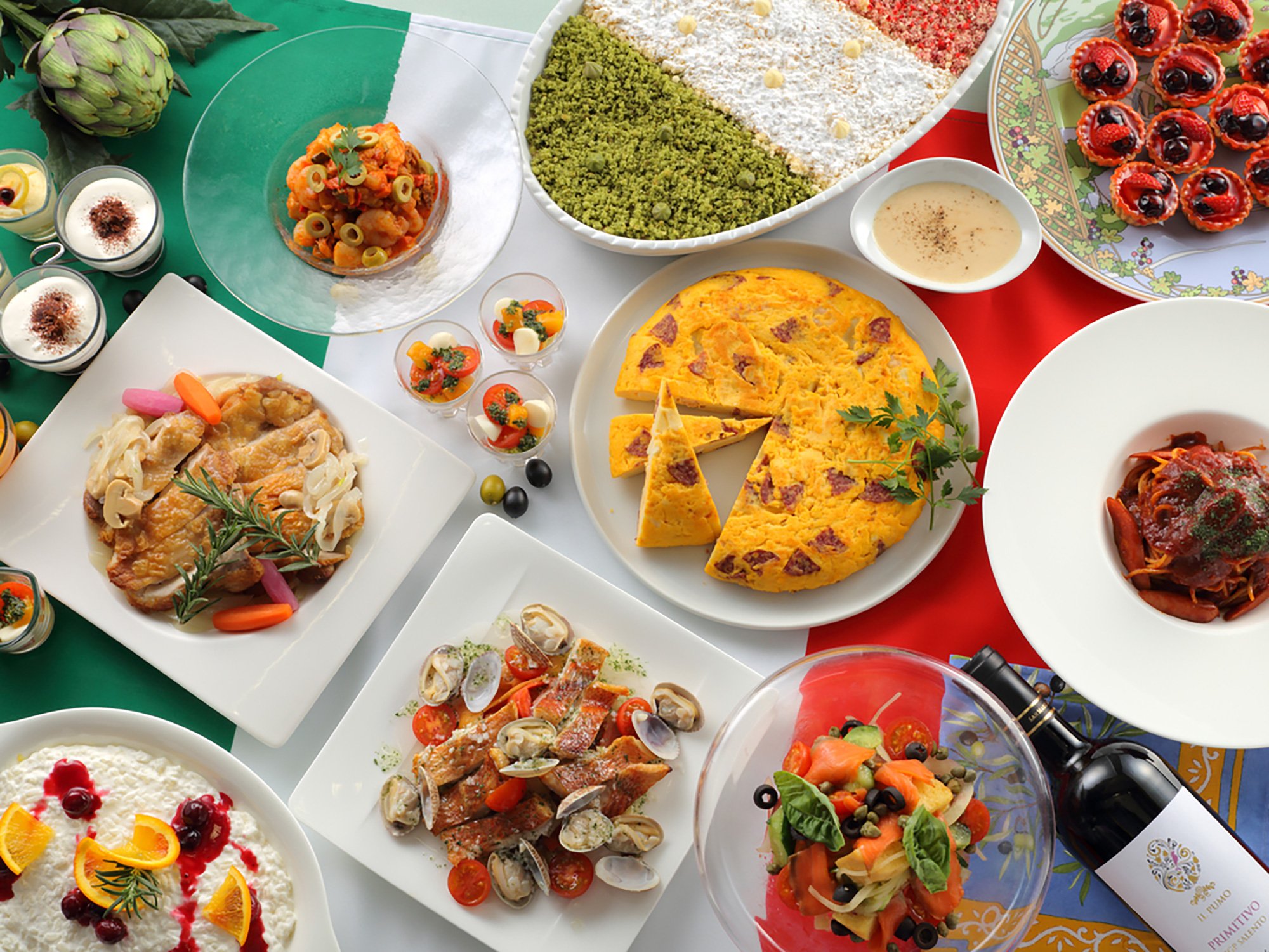 日替わり焼き立てピザ/彩り野菜入りシボラタ風パスタ/フジッリパスタのトラパネーゼ/白身魚のアクアパッツァ仕立て/ローマ風カチャトーラ/茸のリゾット ポルチーニ茸の香りを/ミネストローネ/コンソメミルファンティ/シーフードとカポナータのマリネ仕立て/マンゴーとトマトのカプレーゼ風/スモークサーモンと野菜のパンツァネッラ風サラダ/生ハムとサラミ、ポテトのフリッタータ/自家製ピクルス/蒸し鶏と茸のバルサミコソース/海鮮入りトマトと玉子の中華炒め(※ディナーのみ)/豚肉と春キャベツのスープ煮/ミニ花ちらし寿司(※ディナーのみ)/大根と牛蒡の甘辛煮/フライドポテト/キッズピザ/ミートソーススパゲティ/本日のカレー/サラダ各種/フルーツ各種/マスカルポーネタルト/パンナコッタ/ティラミス/リゾ・インペラトリッチェ(お米のムース)/トルタ・デ・ピスタチオ/栗のバヴァレーゼ/リコッタ・リモーネ