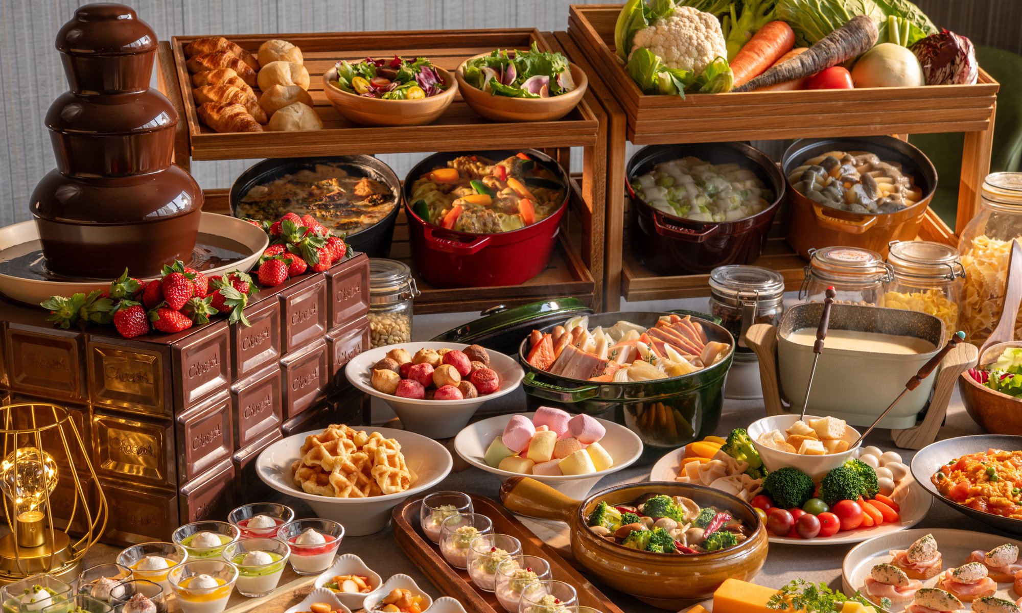 フルーツ&デザート チョコレートファウンテン/焼きたてフリアンのワゴンサービス/シフォン・アソート/抹茶どら焼き/黒ごまぜんざい/酒粕のブランマンジェ/気まぐれプディング/ジュレ・ド・カフェ etc