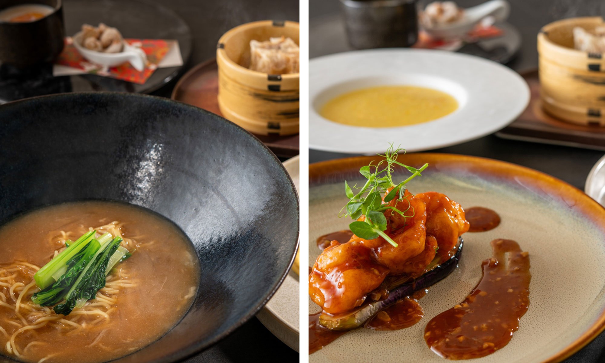 前菜サラダ仕立て、焼売、メインプレートまたは選べる麺、デザートがセットになったランチメニュー。