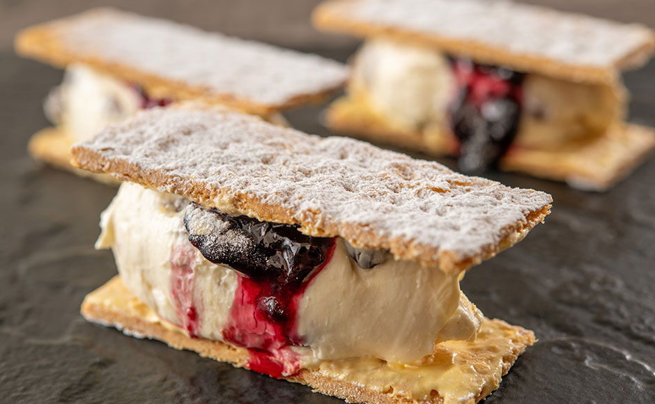 酥脆派皮包裹着稀有芝士慕斯,外覆哈斯卡莓果酱。这款甜点唤起北海道雪景意象,呈现甜中带酸的独特风味。