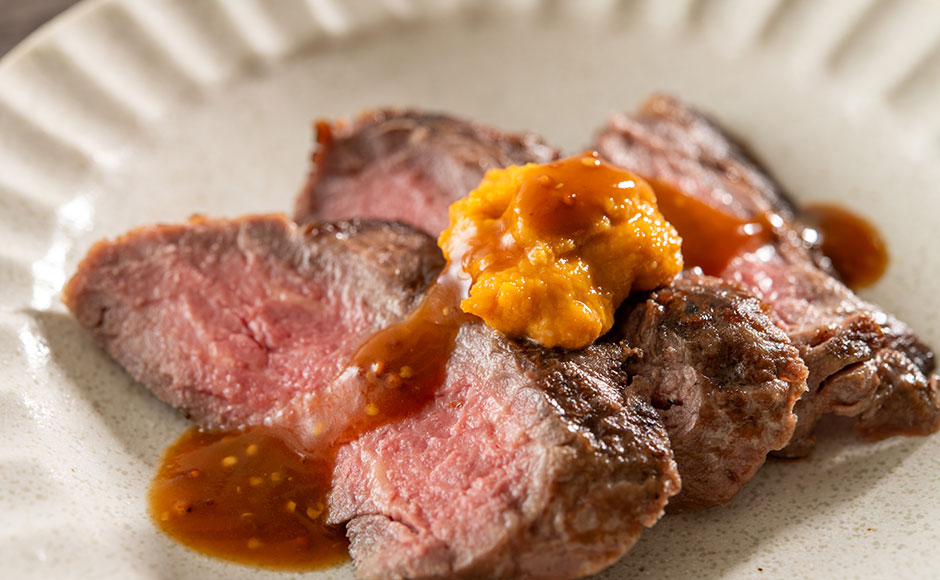慢烤牛肉佐以海胆。搭配两款日式酱汁与盐,随心定制这份奢华滋味。
