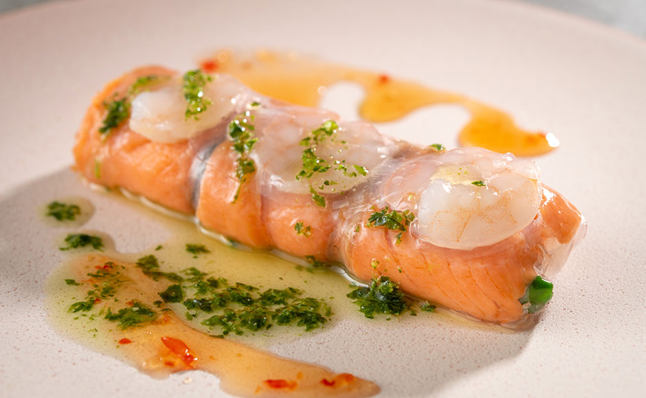 水晶春捲佐鮮蝦煙燻鮭魚配羅勒甜醬